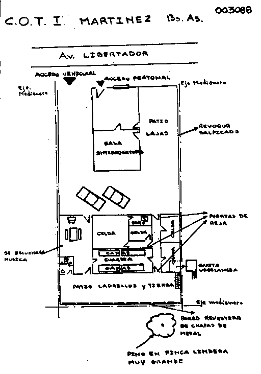 Descripción: Un acceso peatonal hacia un patio central de lajas. Por el acceso principal, sobre Libertador, una construcción de dos habitaciones, una de ellas destinada a sala de torturas e interrogatorio. Al fondo del patio, una edificación entre medianeras, incluyendo tres celdas individuales y una más grande, sala de estar, dormitorio del personal y baños. Hay una garita elevada. Entre el edificio descripto y la medianera del fondo - cuya pared está revestida de chapas de metal - se encuentra un patio estrecho de ladrillos y tierra desde el cual se divisa un pino de gran tamaño de una casa lindera.