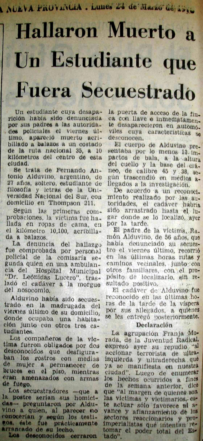 Nando tenía 27 años. Era estudiante de la Universidad Nacional del Sur. Fue secuestrado la madrugada del 21/03/75. Su cadaver apareció dos días después.